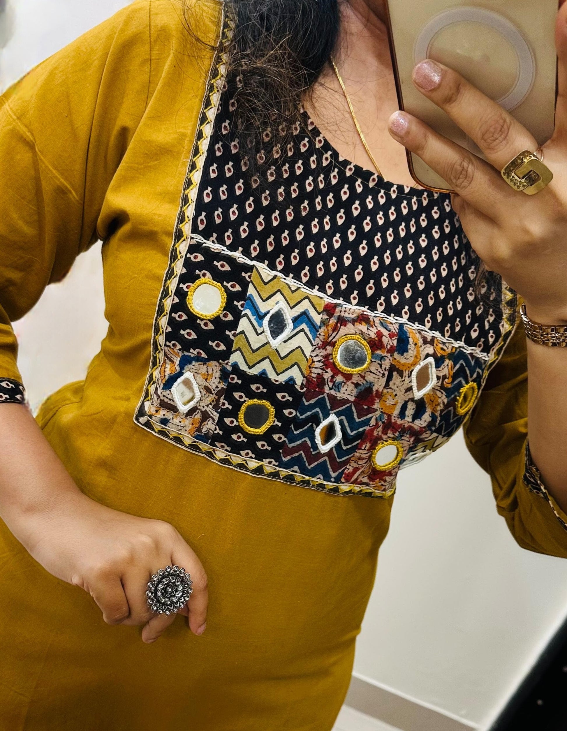 *Kurti Pant Set in Dhabu Cotton Fabric* with beautiful applique mirror thread detailing in yoke giving perfect smart Look