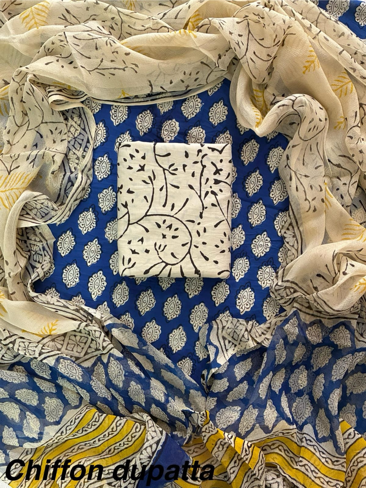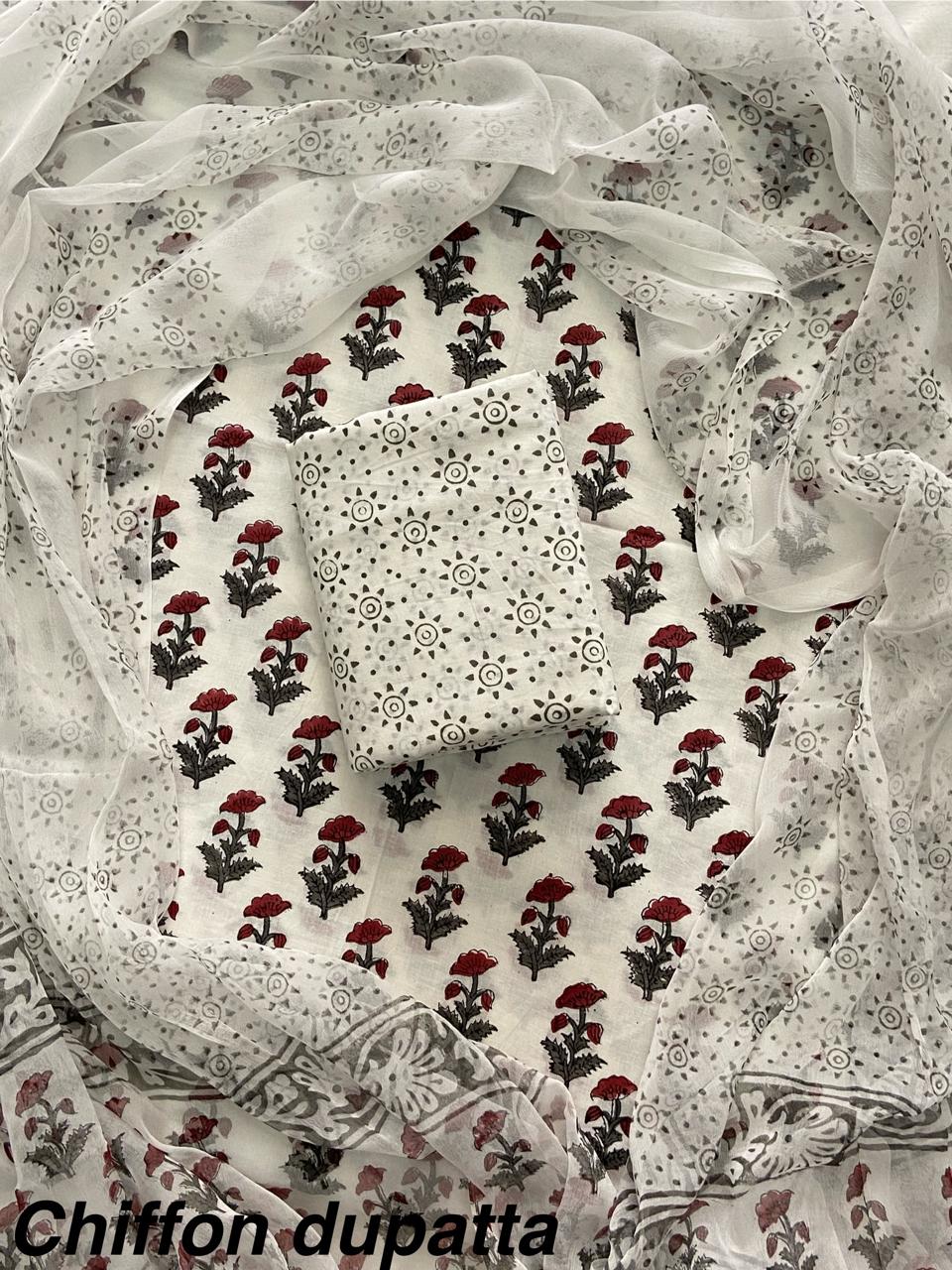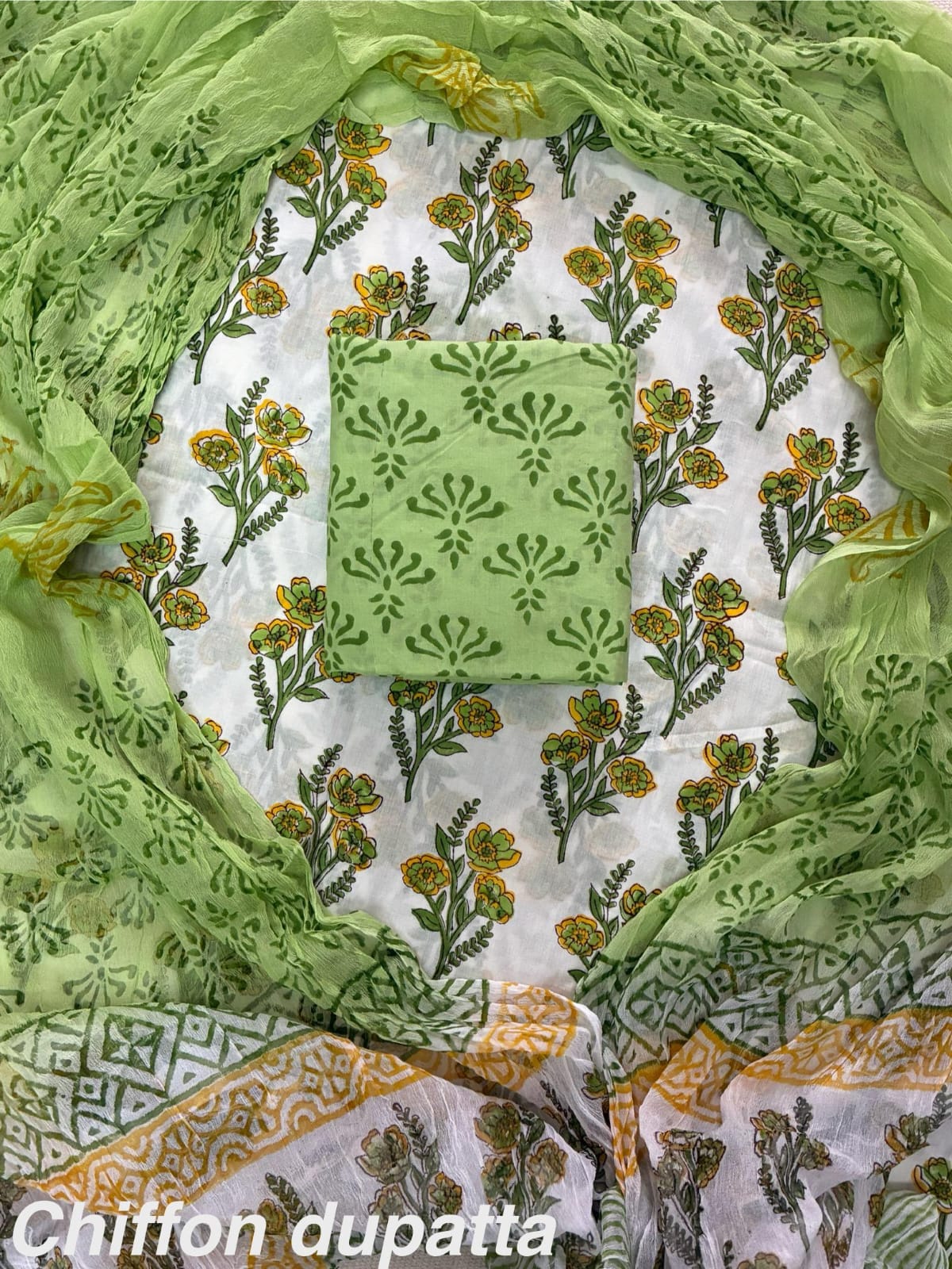 Comes with cotton top , bottom and chiffon dupatta.