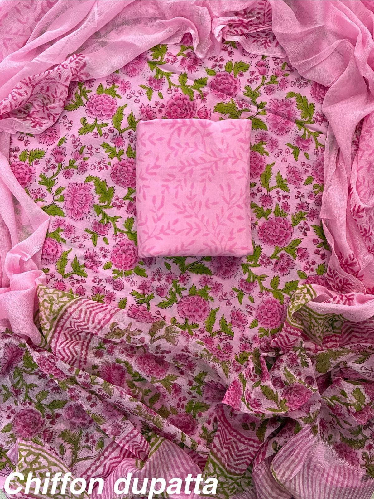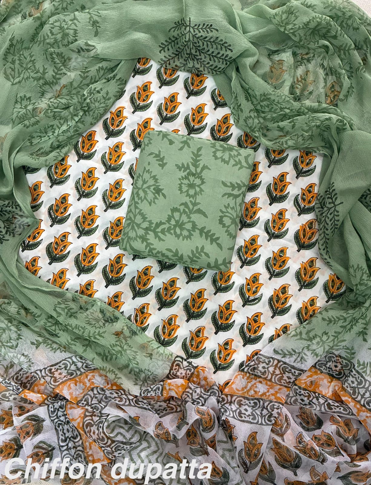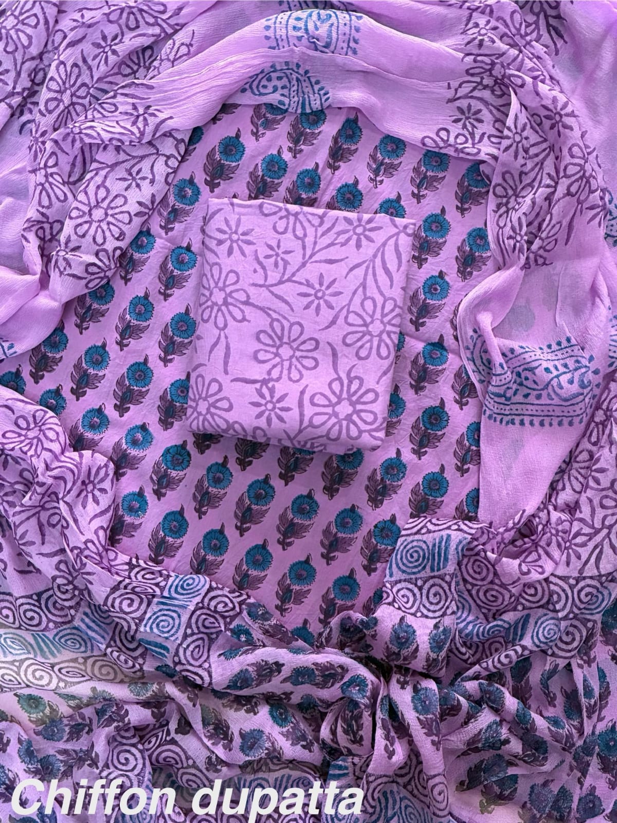 Comes with cotton top , bottom and chiffon dupatta.