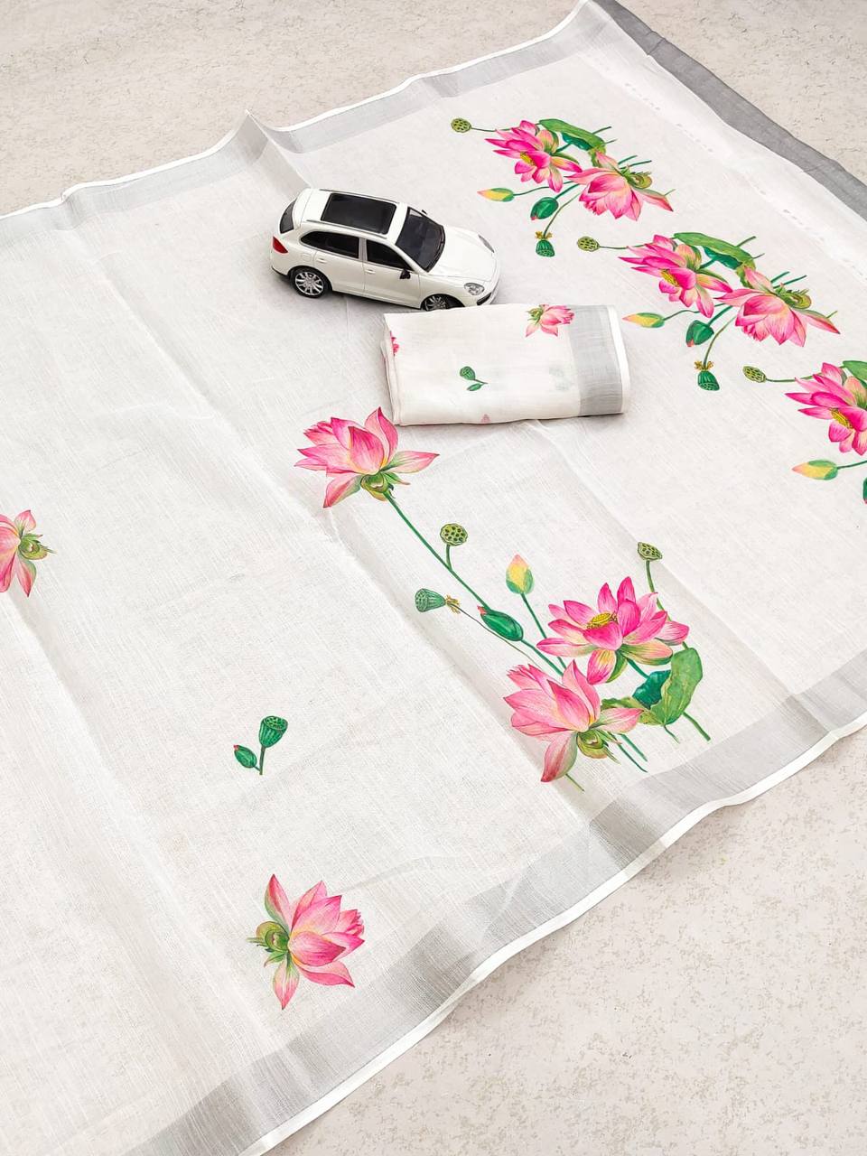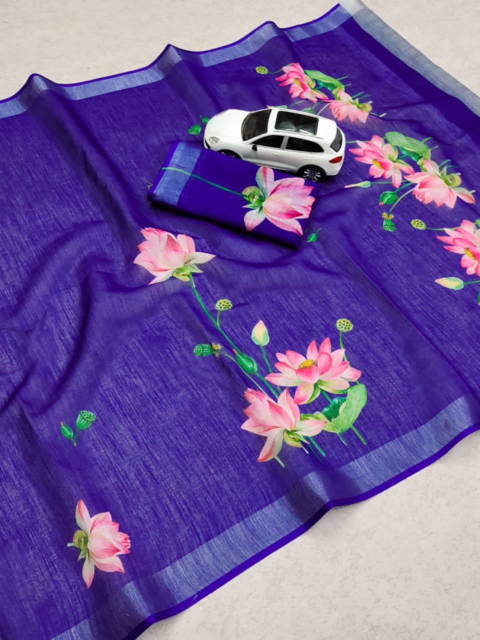 Wrap yourself in elegance with this linen saree adorned with a delicate lotus digital print. Lightweight and breathable, it drapes effortlessly, making it perfect for both casual gatherings and festive occasions. The subtle lotus motifs add a touch of serenity and grace, while the natural linen fabric ensures comfort all day long. Pair it with minimal jewelry for a chic, sophisticated look .