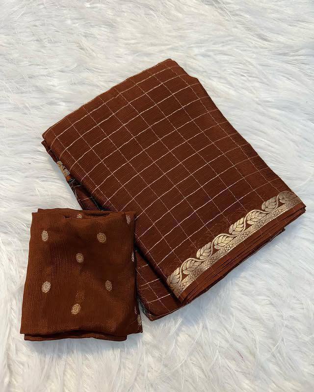 Step into timeless charm with this lightweight viscose georgette saree, designed to make every occasion special. The saree features a delicate check pattern flowing beautifully throughout the fabric, adding a subtle texture and sophistication. A leaf-patterned border gracefully frames the drape, giving it a refined and elegant finish.